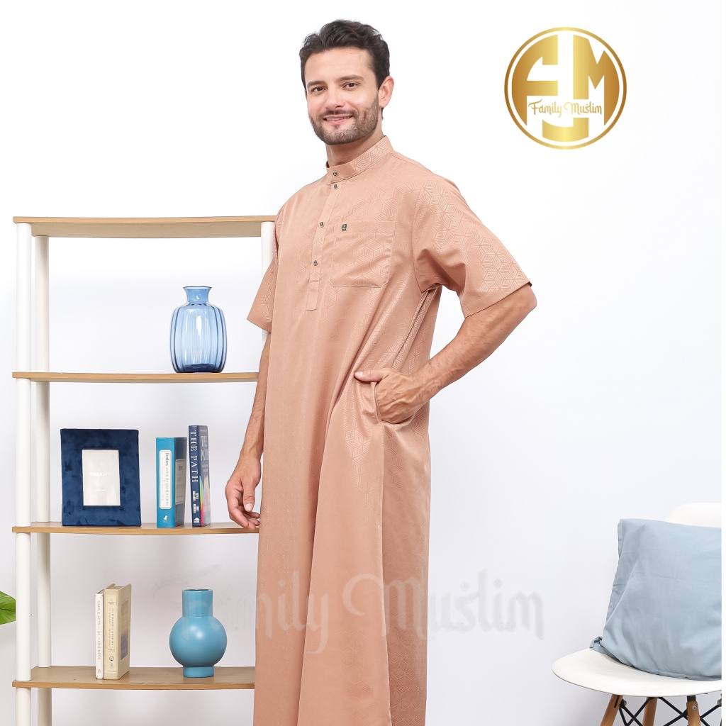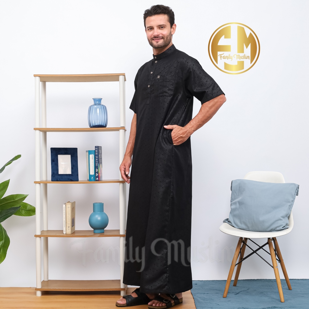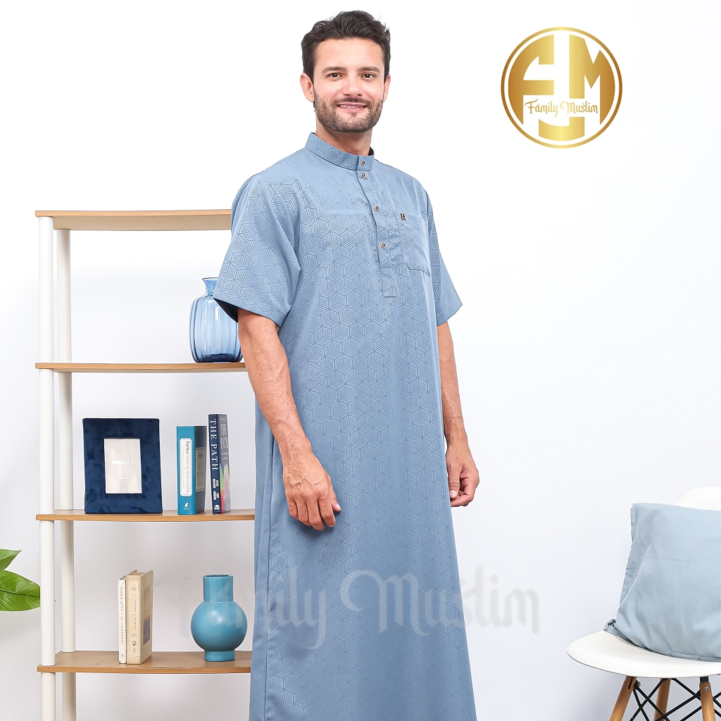 Family Muslim - Jubah Pria Dewasa Lengan Pendek Slimfit Motif Emboss Al-HARIZ Navy