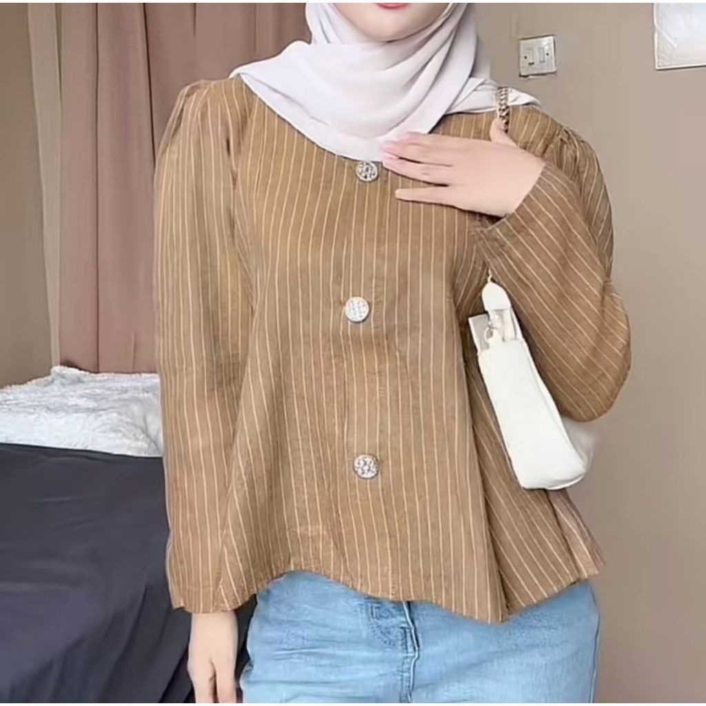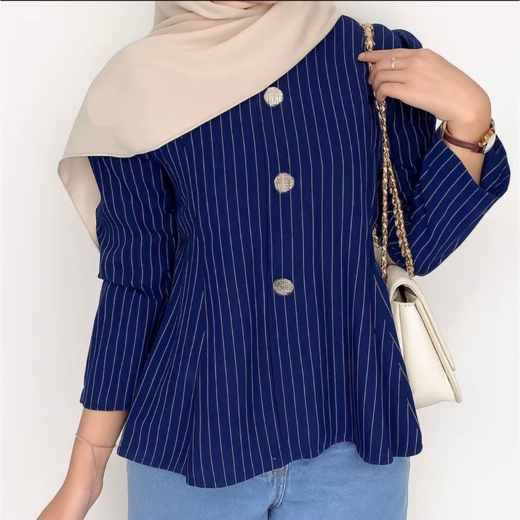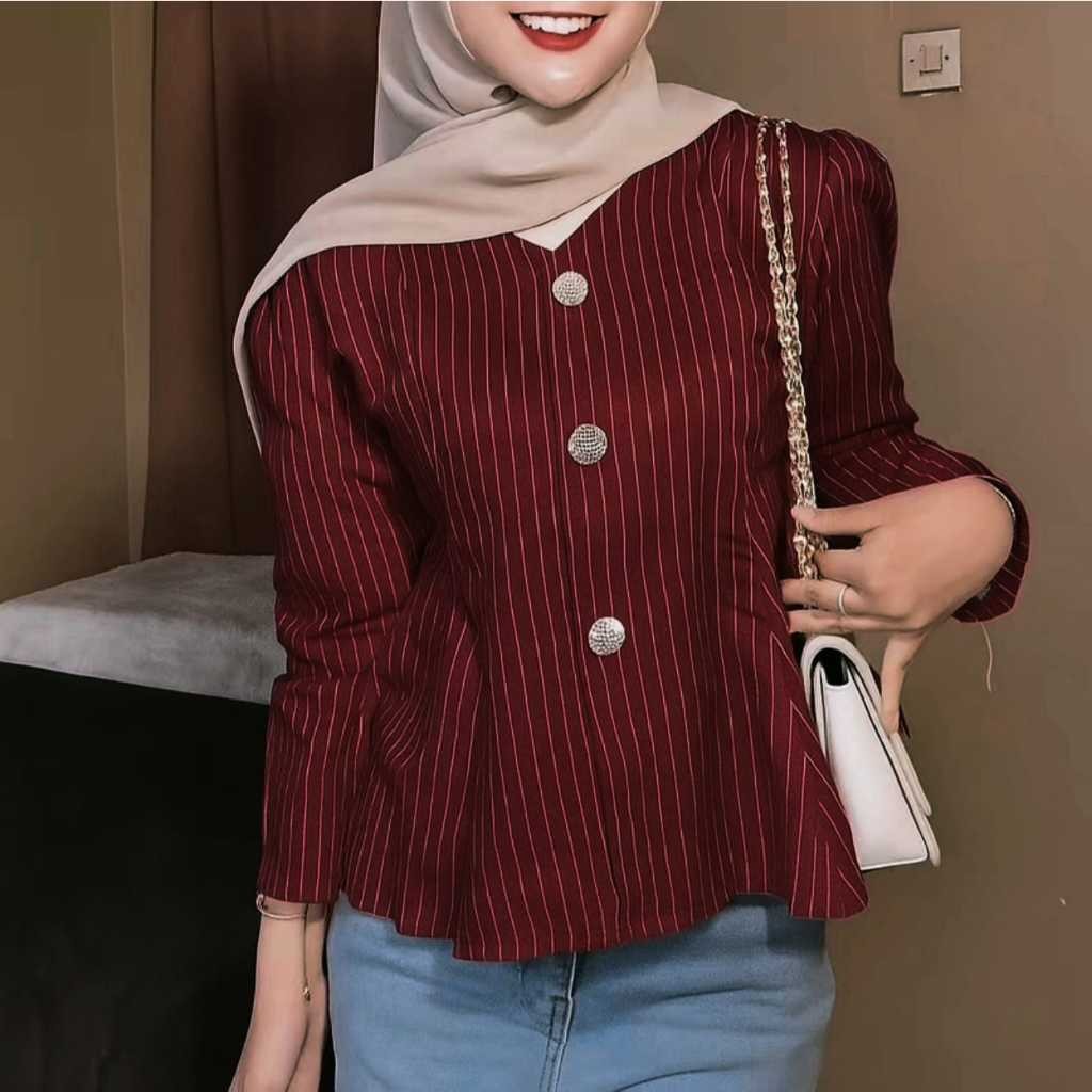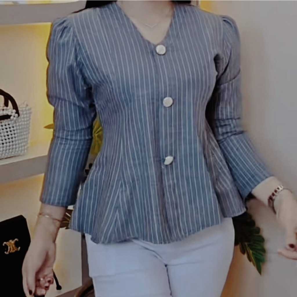Arica Top Blouse Stripe Atasan Peplum Wanita Salur Lengan Puff Fit Body Fitted