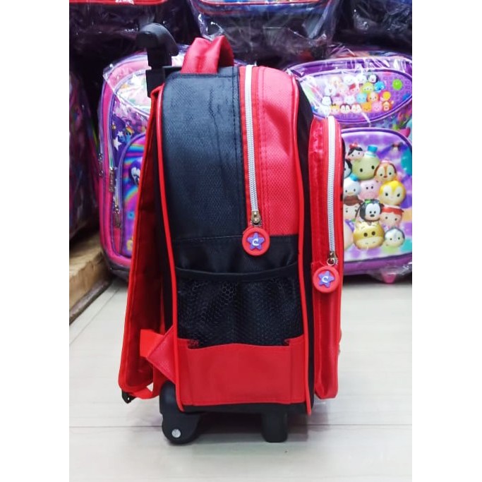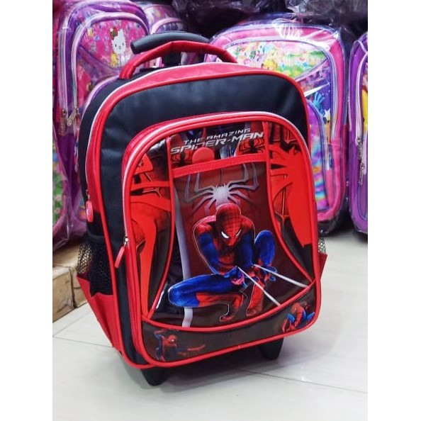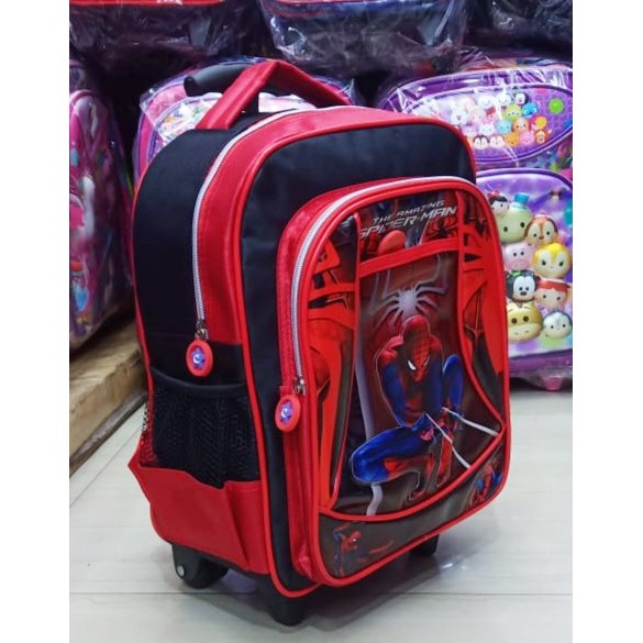 PROMO Tas Roda Dorong Trolley Anak TK Gambar Anak Laki Laki Laba Laba Jaring Soft Timbul 3 Kantung