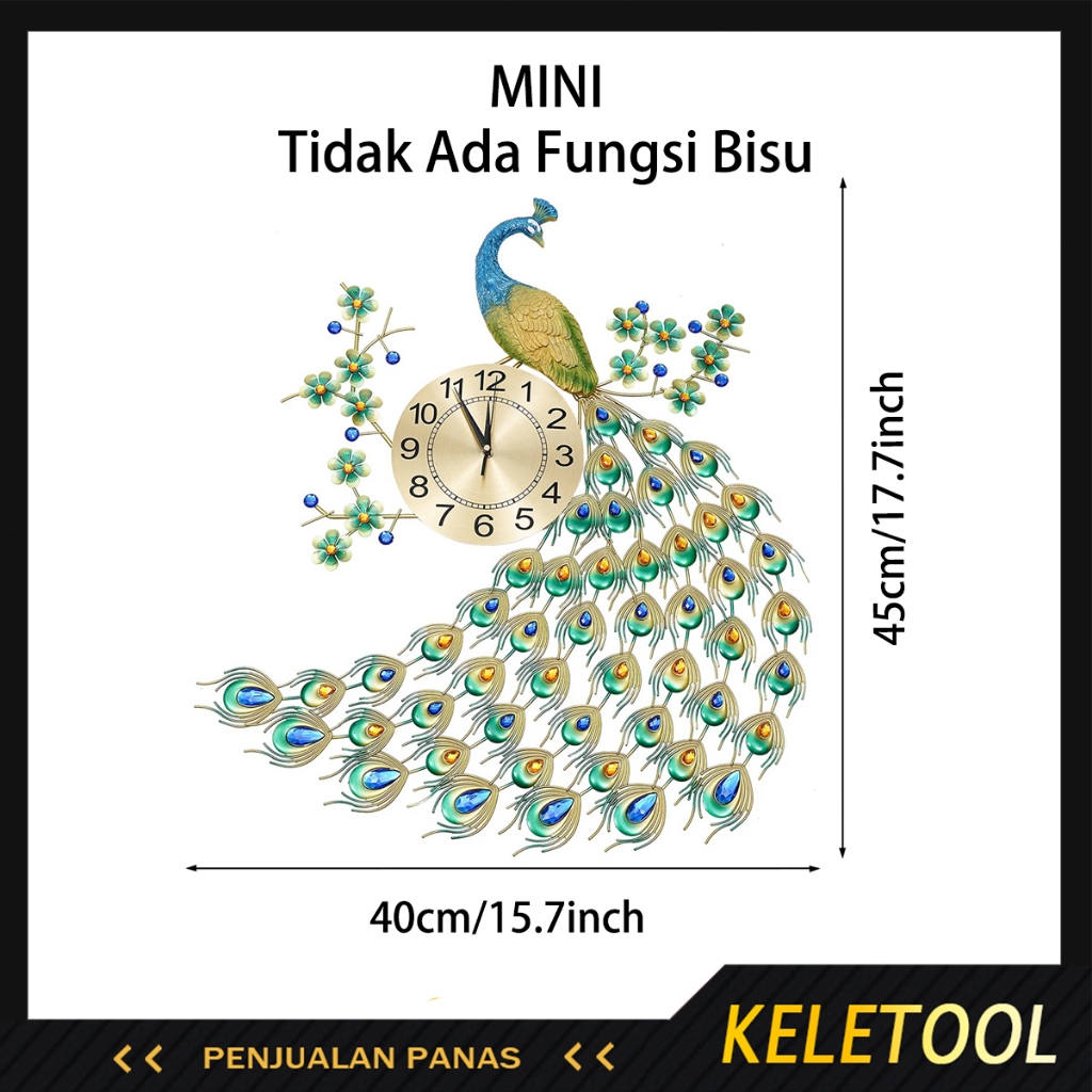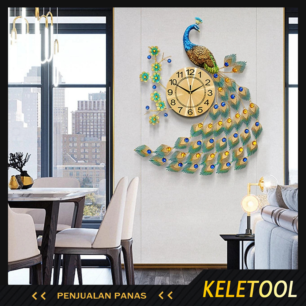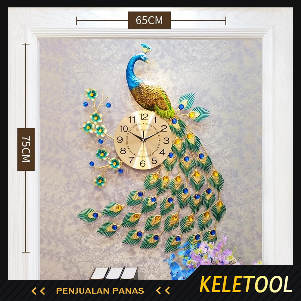 KELETOOL 65 x 75cm Merak Jam Dinding Besar Merak Jam dinding Kepribadian Cina Kreatif Jam Rumah Mode Bisu Dekorasi 3D Quartz Merak Jam Dinding Besar Giant Wall Clock Creative Untuk Ruang Tamu Kamar Tidur