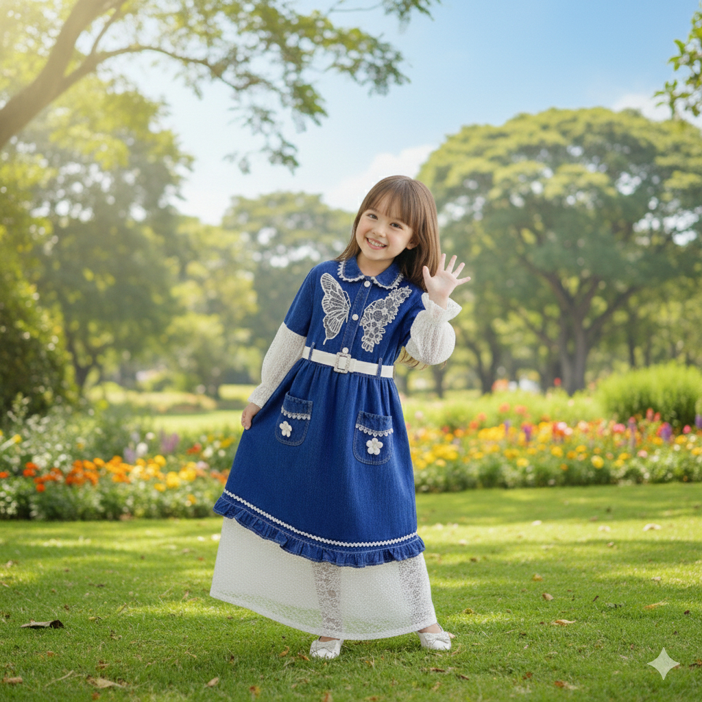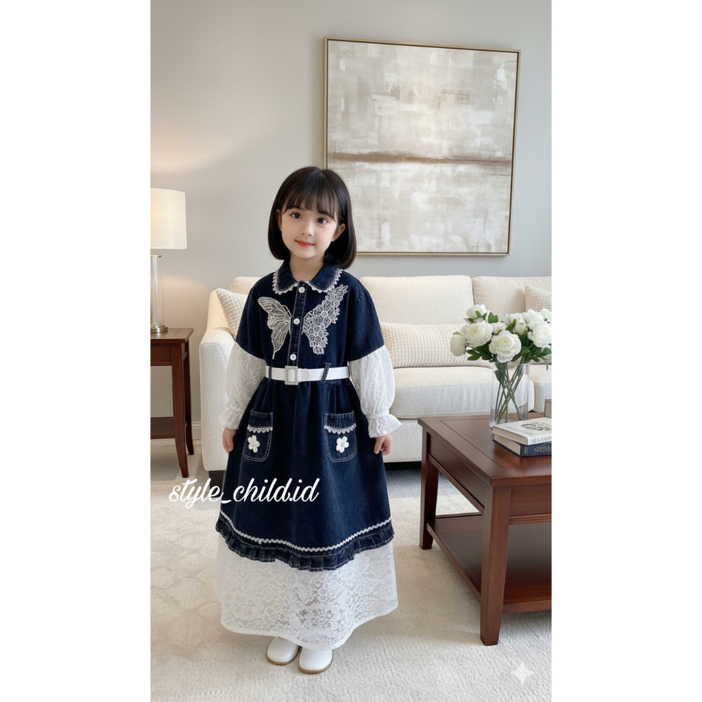 HAPPY CHEN-CHEN =GAMIS JEANS MIX BRUKAT ANAK PEREMPUAN USIA 3-10 TAHUN / LONG DRESS ORGANZA LENGAN PANJANG / DRESS MEWAH FREE TAS BAJU RAYA BAHAN ADEM DAN NYAMAN [ COD]