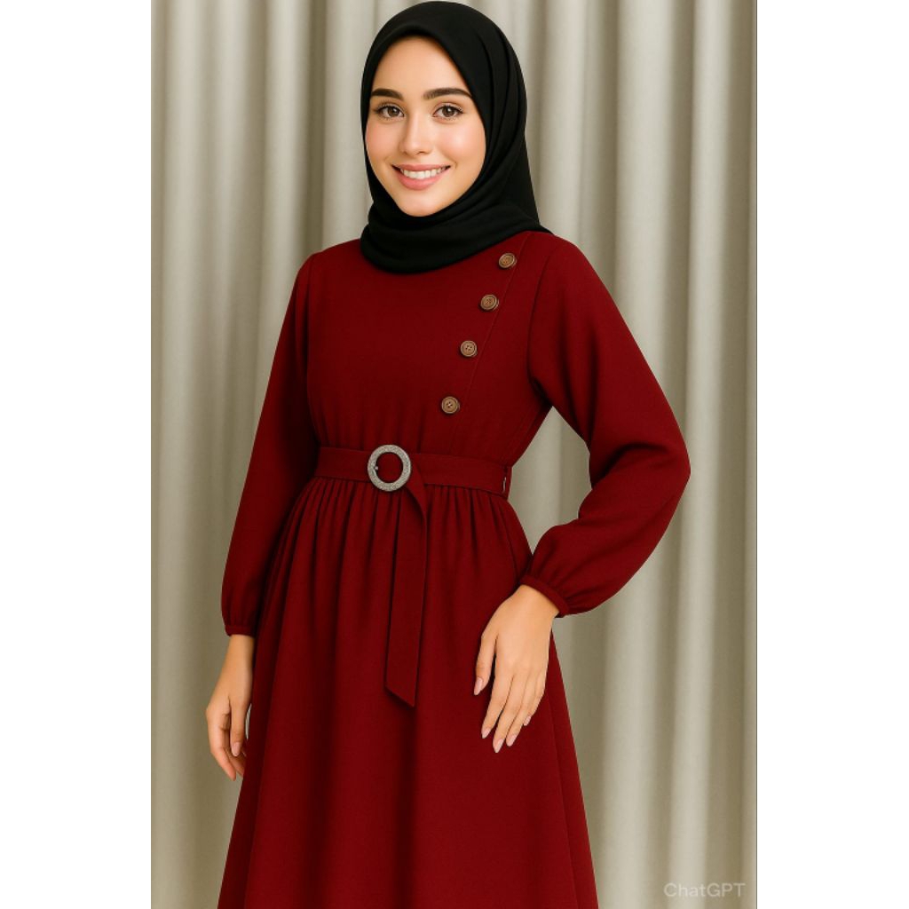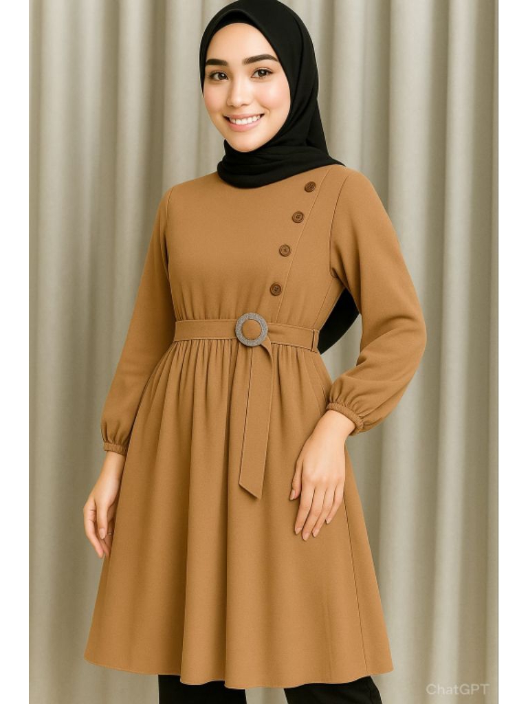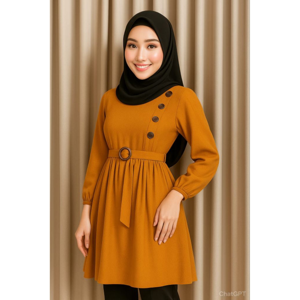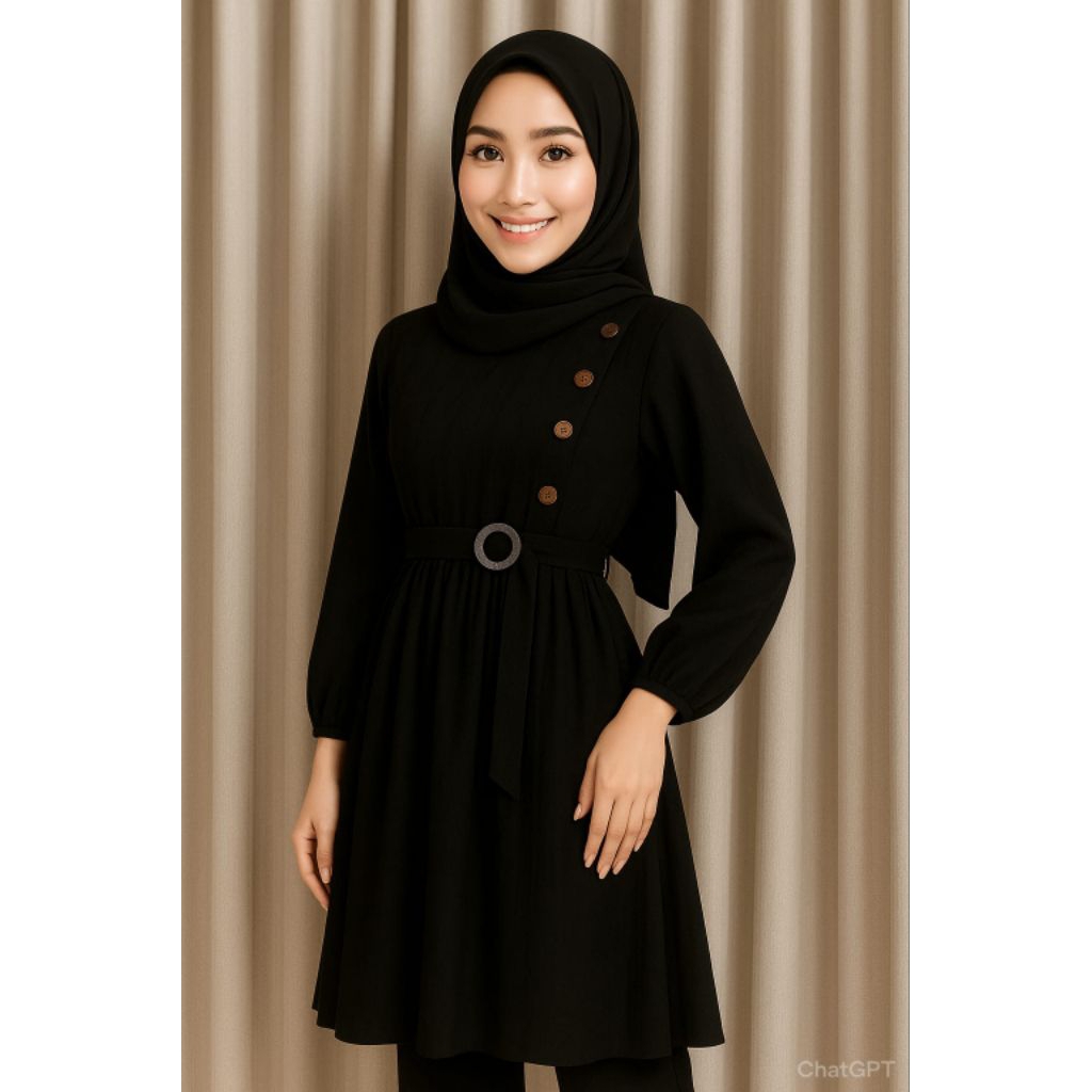 Tunik Wanita Muslimah Elegan Warna Hitam – Atasan Lengan Panjang dengan Belt & Kancing Samping | Tunik Kekinian Hijabers