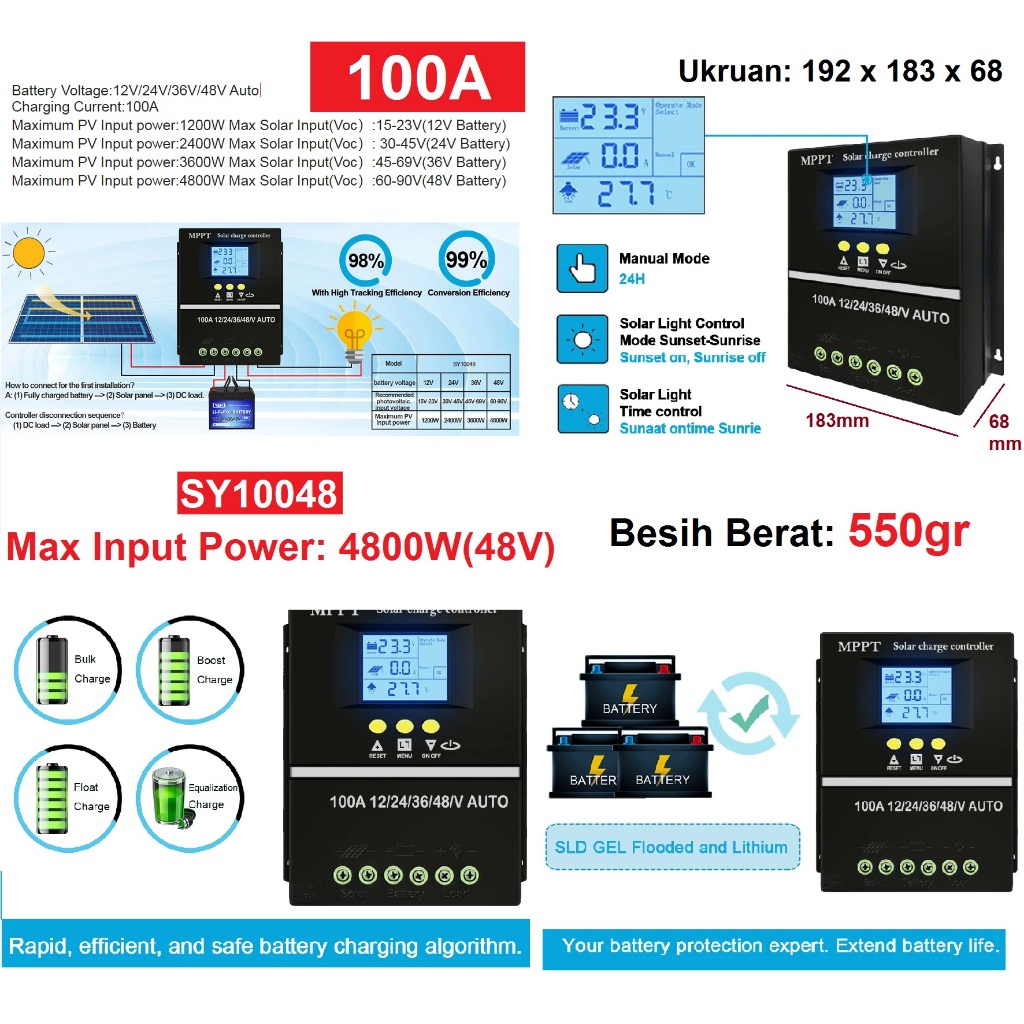Solar Charge Controller PWM 60A 80A 100A 1200W 12V 2400W 24V 3600W 36V 4800W 48V SY10048 Smart Charging Protection LCD Display