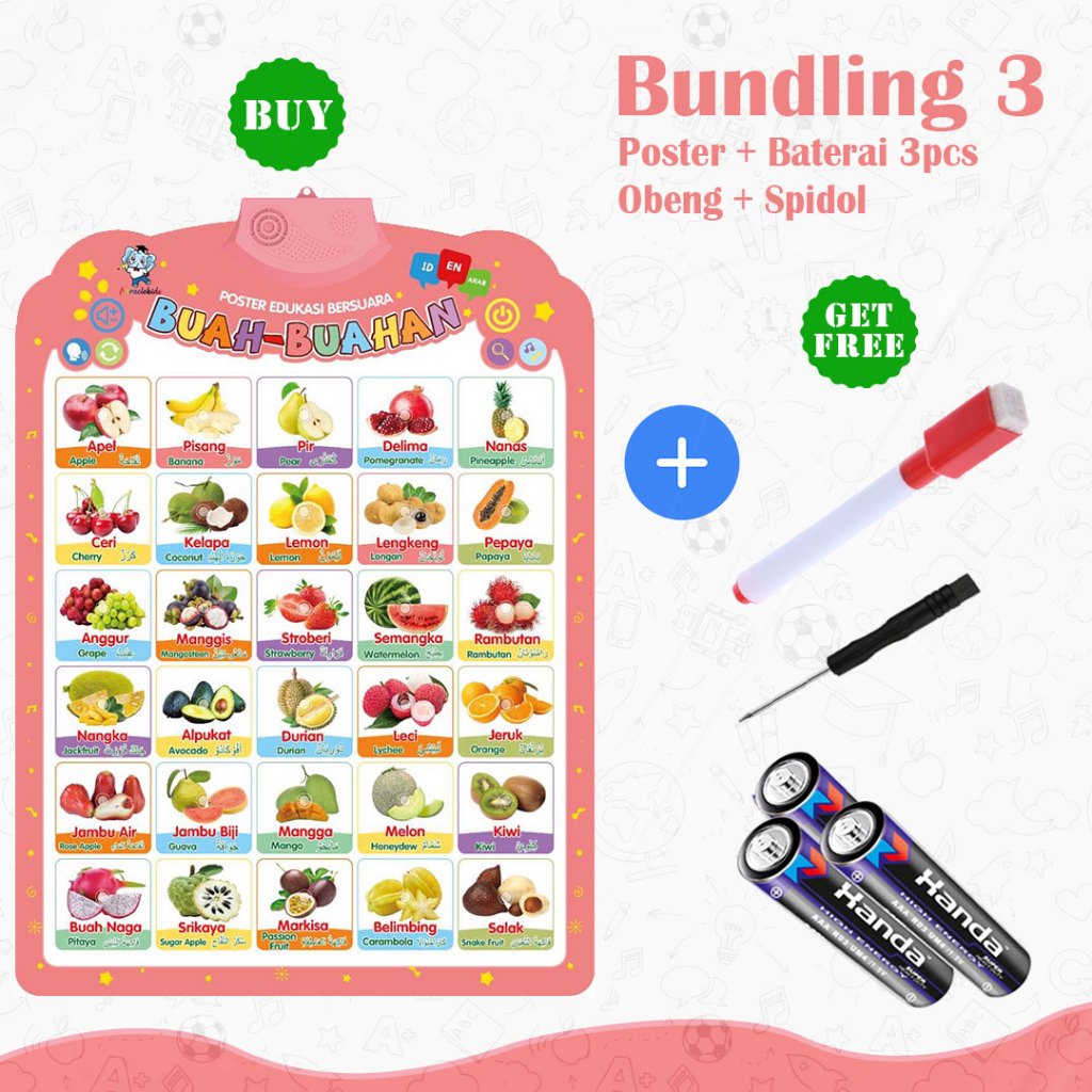 Mainan anak poster buah buahan edukasi bersuara bermain sambil belajar bahasa indonesia inggris arab