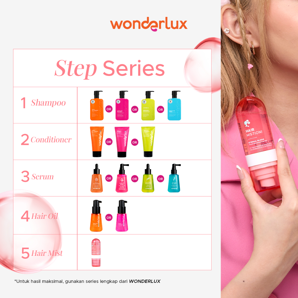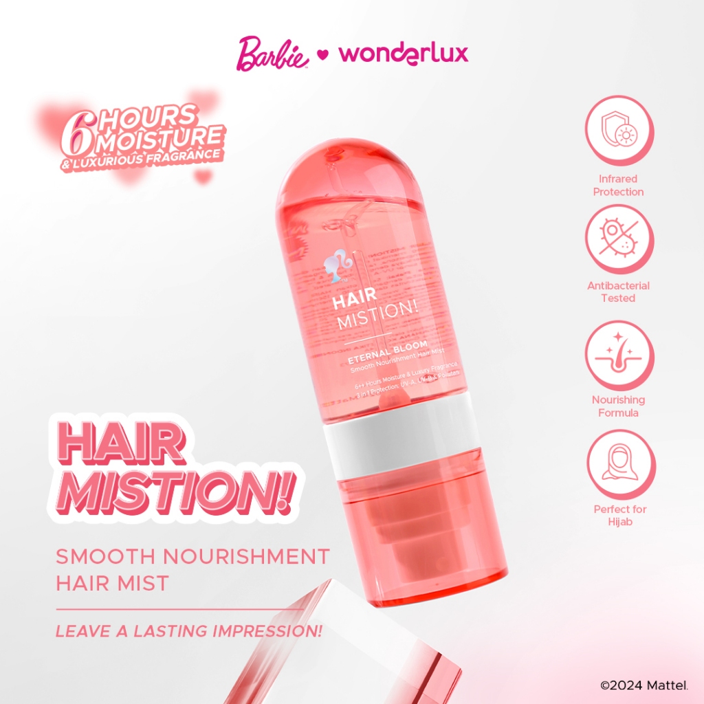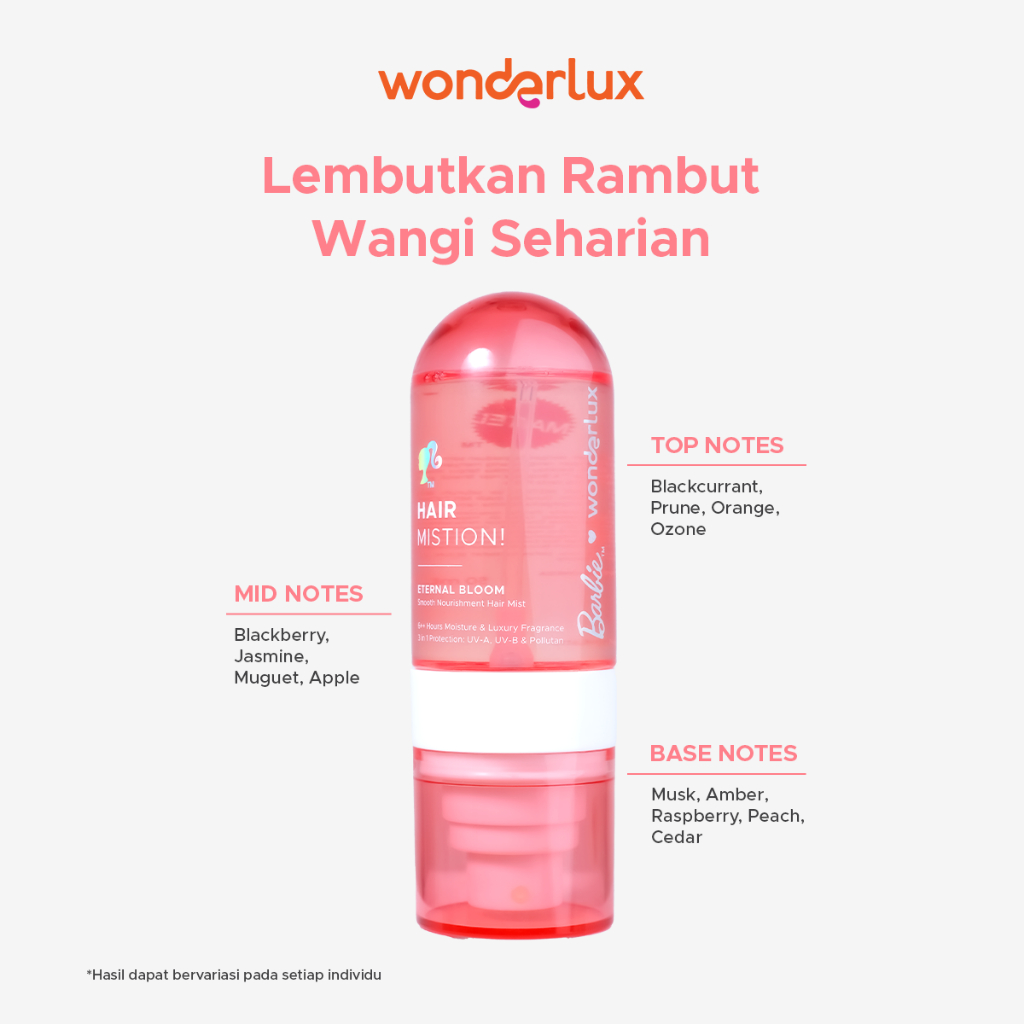 Wonderlux Hair Mistion! Eternal Bloom Hair Mist Wangi Fruity Fresh 50ml Proteksi Maksimal Atasi Sinar Matahari UV-A UV-B Polusi Ekstra Lembab dan Tahan 6 Jam++