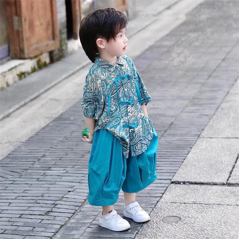 Boys' suit Chinese classics retro children's small floral shirt seven part Bloomers two-piece suit