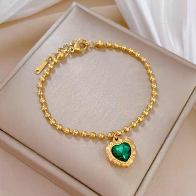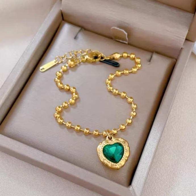 gelang titanium rantai bijilada bandul LOVE hijau safir anti karat
