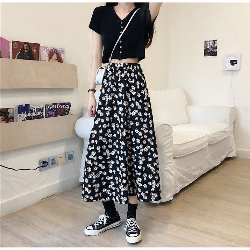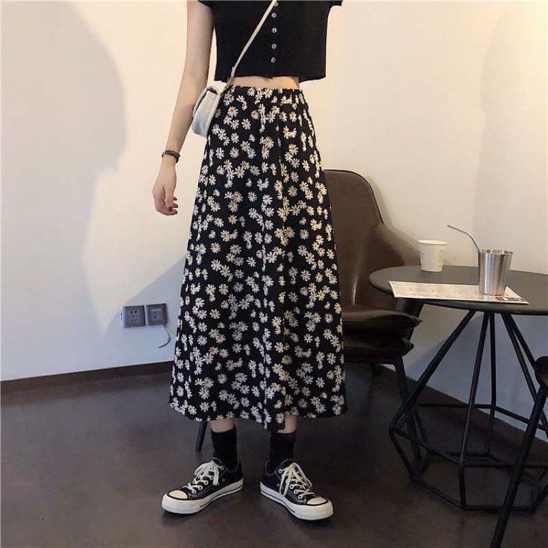 savalia | Rok Midi Wanita Model Longgar Pinggang Karet Motif Bunga Gaya Korea