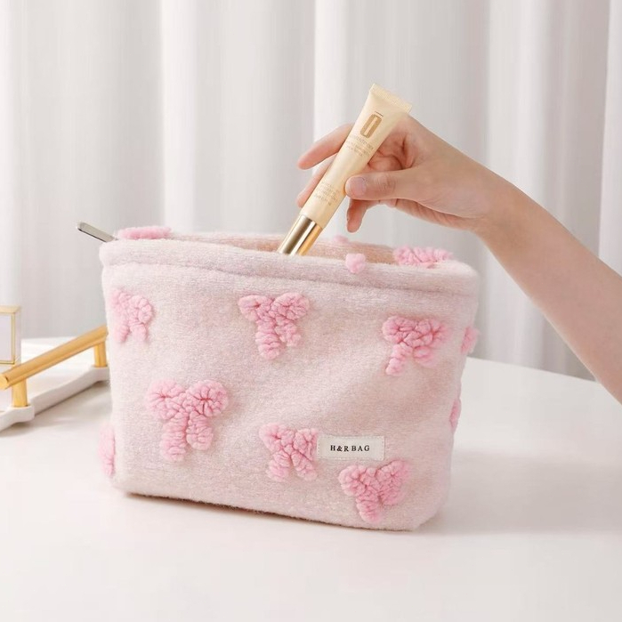Tas Make Up Wanita Motif Pita Pink Bulu Lucu Tempat Kosmetik dan Skincare Portable