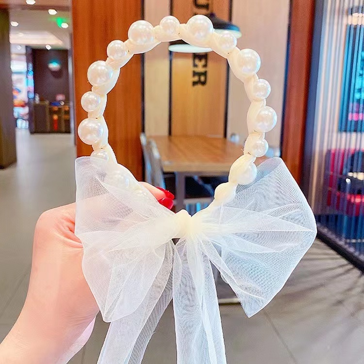 GU Bandana Mutiara Pita Tulle Panjang Bisa diikat Gaya Korea Bando Anak Import Bando Mutiara Tali Kepang A-11