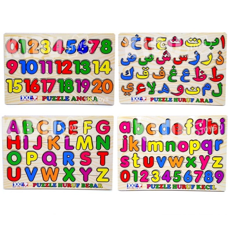 puzzle kayu edukasi - paket puzzle huruf besar, huruf kecil, angka, huruf hijaiyah