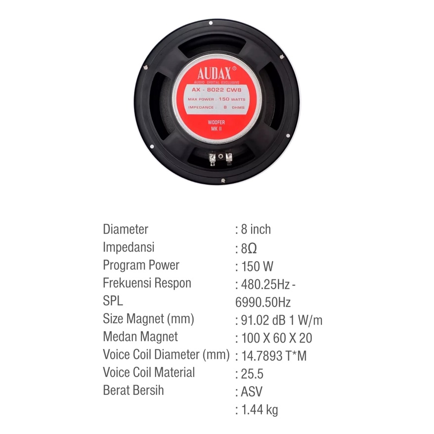 speaker 8inch audax 150watt ax 8022 cw8 bukan 8020 m8